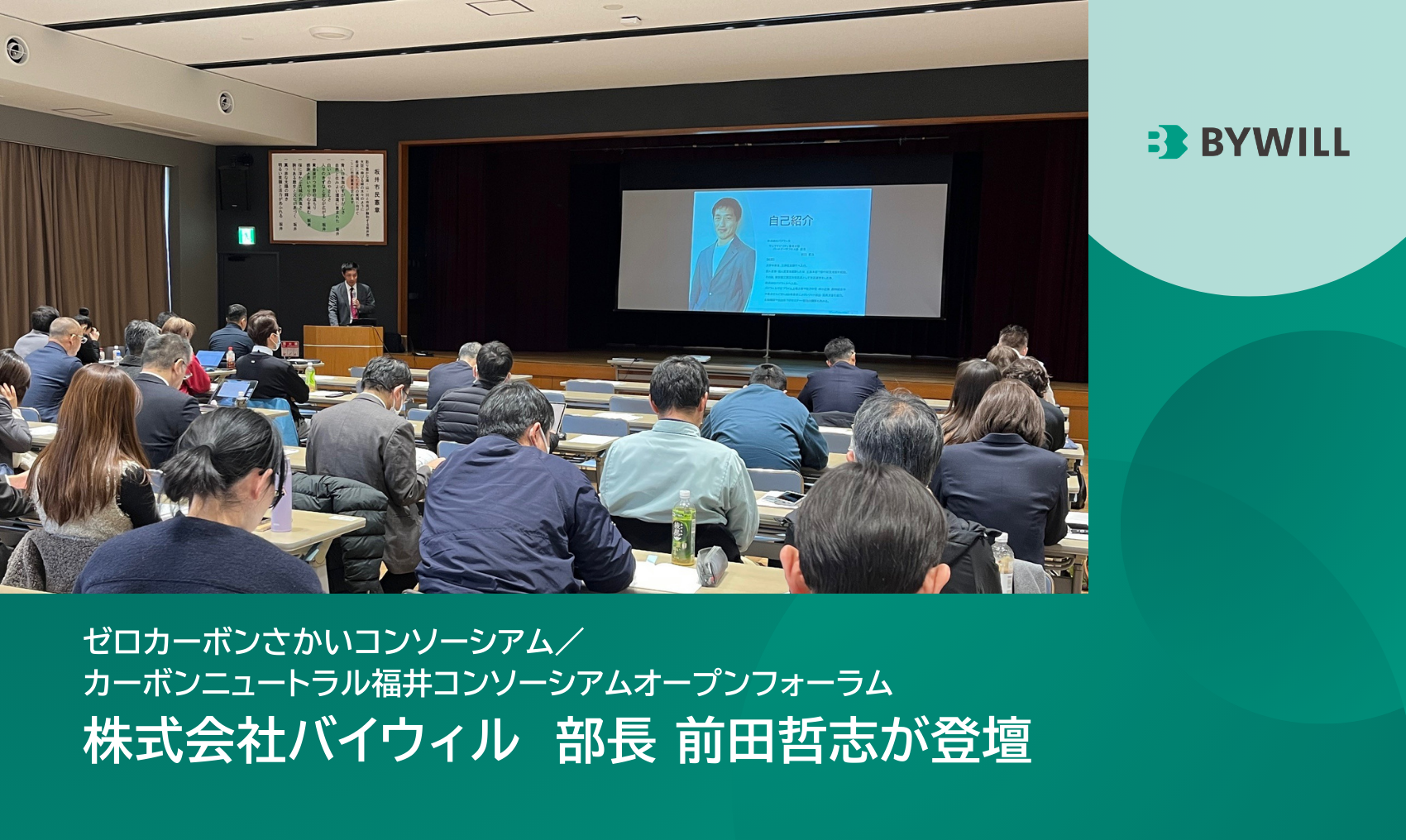 本セミナーは、ゼロカーボンシティをいち早く宣言し、先進的な活動を続ける坂井市の「ゼロカーボンさかいコンソーシアム」の枠組みを活かし、福井県が推進する「カーボンニュートラル福井コンソーシアム」との共催イベントで行われました。